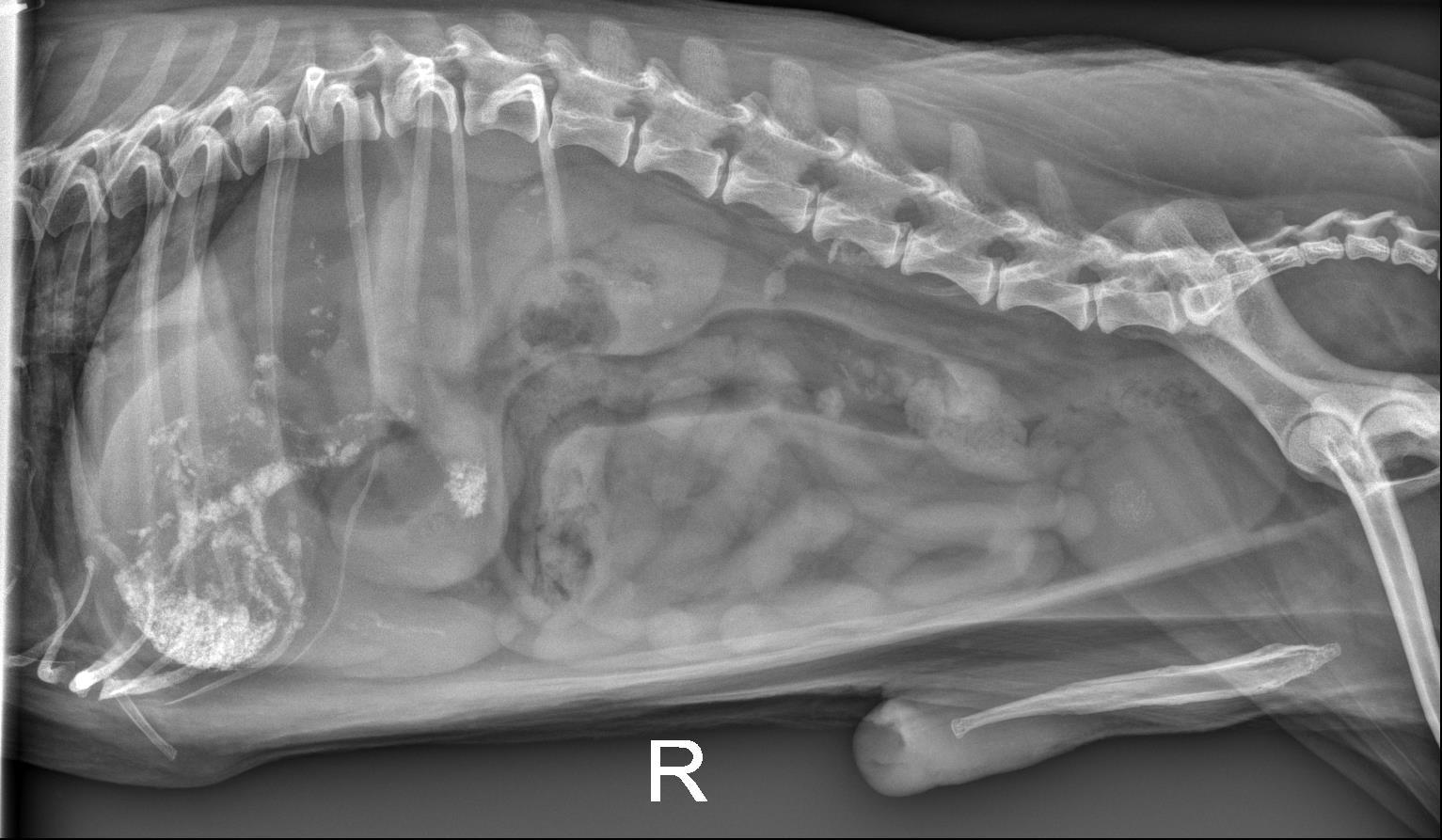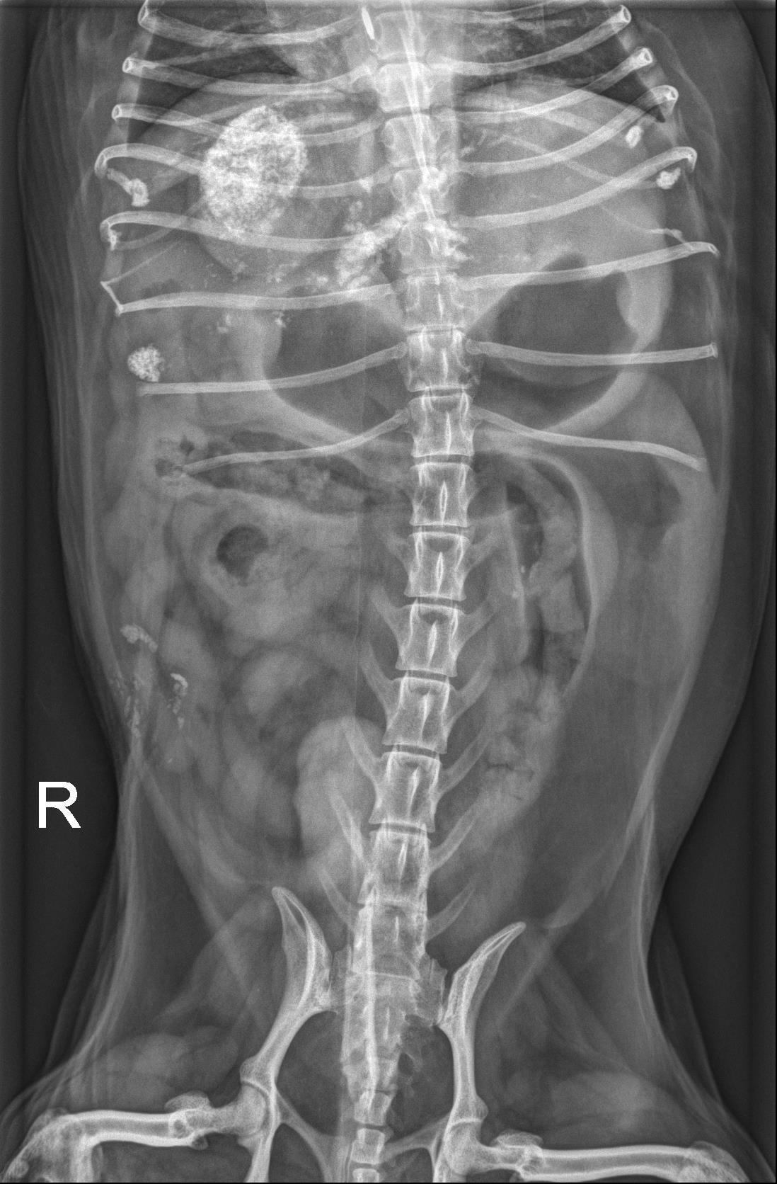 There are numerous, stippled to angular, mineral opaque foci in the gallbladder and throughout the hepatic parenchyma which are suspected to be within the biliary tract, given the linear/arborized appearance. The liver is mildly enlarged with rounded margins extending beyond the costal arch. Best identified on the ventrodorsal radiograph, there is focal accumulation of this mineral superimposed with the proximal portion of the descending duodenum.