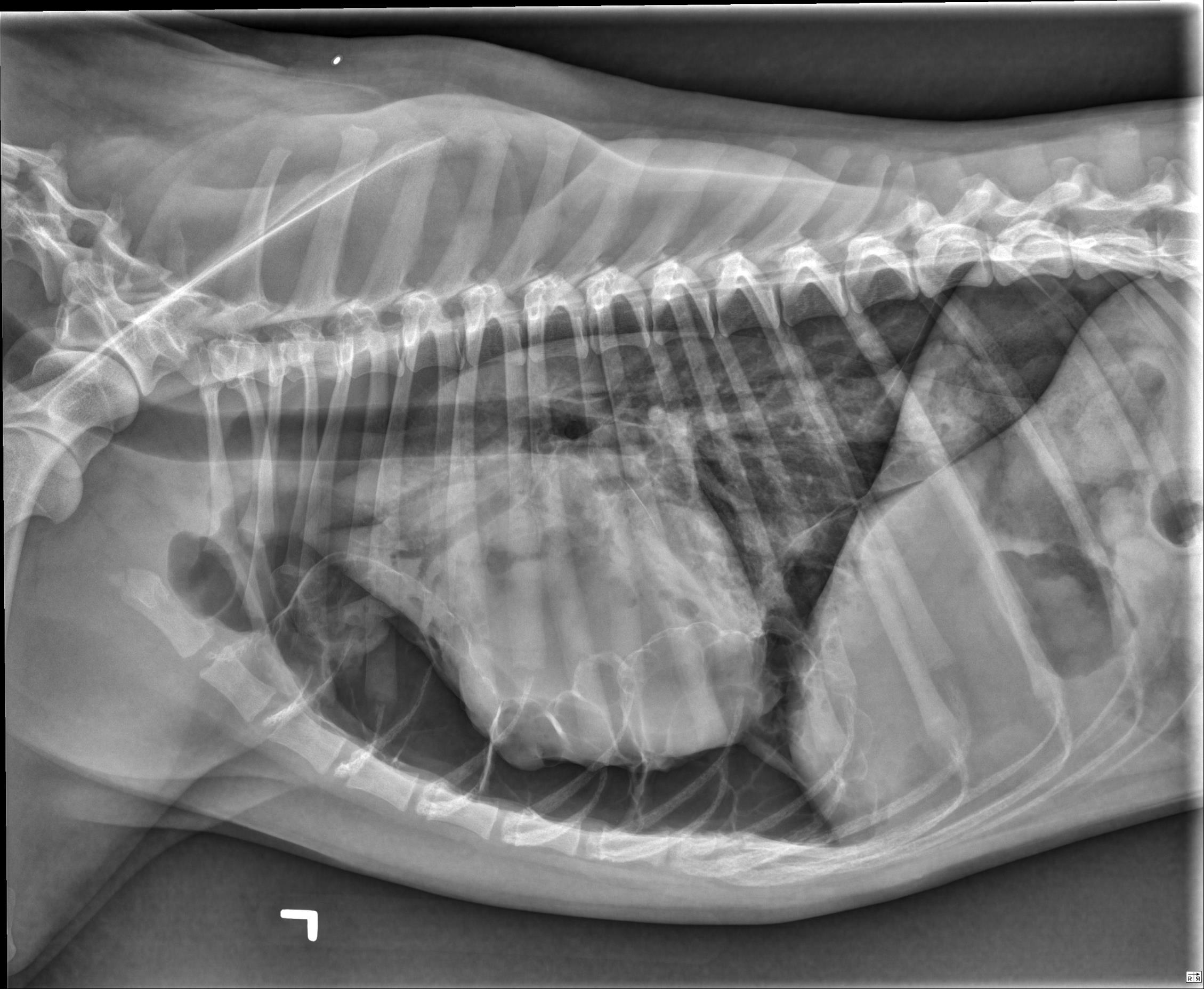There is a large volume of gas in the pleural space, bilaterally, with retraction of the pulmonary margins from the body wall. A smaller volume of fluid is also present. In the caudal subsegment of the left cranial lung lobe, there are two well-defined, gas filled structures with a thin, soft tissue opaque rim. The largest measures 2.7cm in diameter, and the smaller, located just cranial to the first measures 0.9cm in diameter. There is an alveolar pulmonary pattern in the ventral aspect of the right cranial lung lobe with an air bronchogram, most prominent on the left lateral projection. Throughout the remainder of the pulmonary parenchyma, there is a mild to moderate, diffuse, unstructured interstitial pulmonary pattern. Dorsal to the second and third sternebrae, there is an ovoid soft tissue structure consistent with an enlarged sternal lymph node (up to 1.6cm in thickness). The stomach contains a moderate volume of heterogenous soft tissue opaque material and gas. The musculoskeletal structures included in collimation are normal.