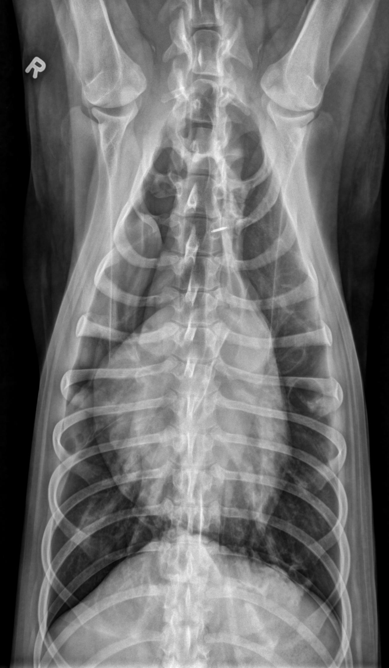 Thorax- ventrodorsal and opposite lateral radiographs are available for review.