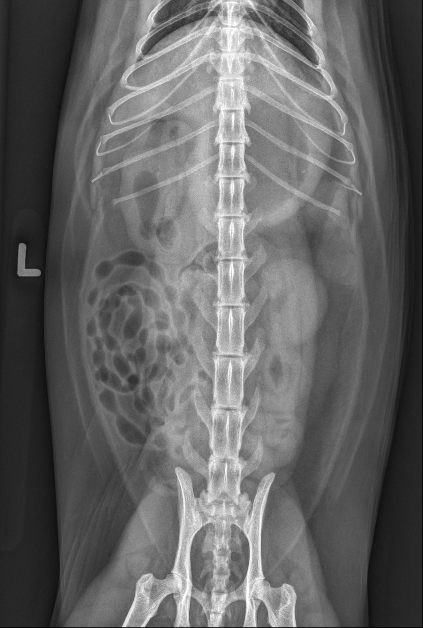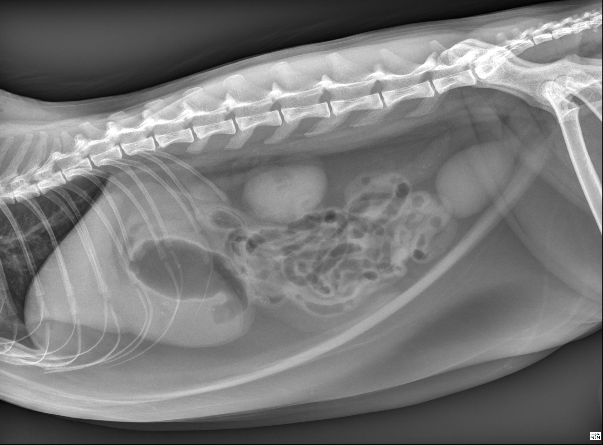 Findings: The stomach is distended with a large volume of fluid, a smaller volume of gas, and a small number of pinpoint, mineral opaque foci. In the orad duodenum, seen ventral to the last pair of ribs in the lateral views and to the right of L2 in the ventrodorsal view, there is an ovoid structure in the duodenal lumen. The structure is gas-filled with a soft tissue opaque border surrounded by a thin rim of gas. It measures approximately 2 cm in length and 1 cm in diameter. The duodenum orad to this structure is mildly distended while the duodenum aborad to this structure appears empty/small in diameter. The remainder of the small intestinal tract is mildly, uniformly distended with fluid and gas in a string of pearls pattern, consistent with peristalsis. The colon contains a small volume of nonformed stool. The serosal detail, liver, spleen, kidneys, retroperitoneal space, and urinary bladder are normal. The imaged skeletal structures and caudal thorax are unremarkable.